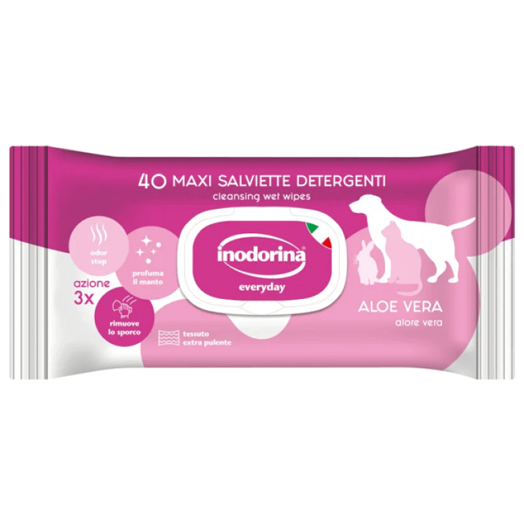 Вологі серветки для всіх типів шерсті котів, собак та кроликів Inodorina Everyday Aloe Vera з ароматом алое вераВологі серветки Inodorina зволожені заспокійливим засобом. Дотримуючись природного pH, вони очищають, дезодо...