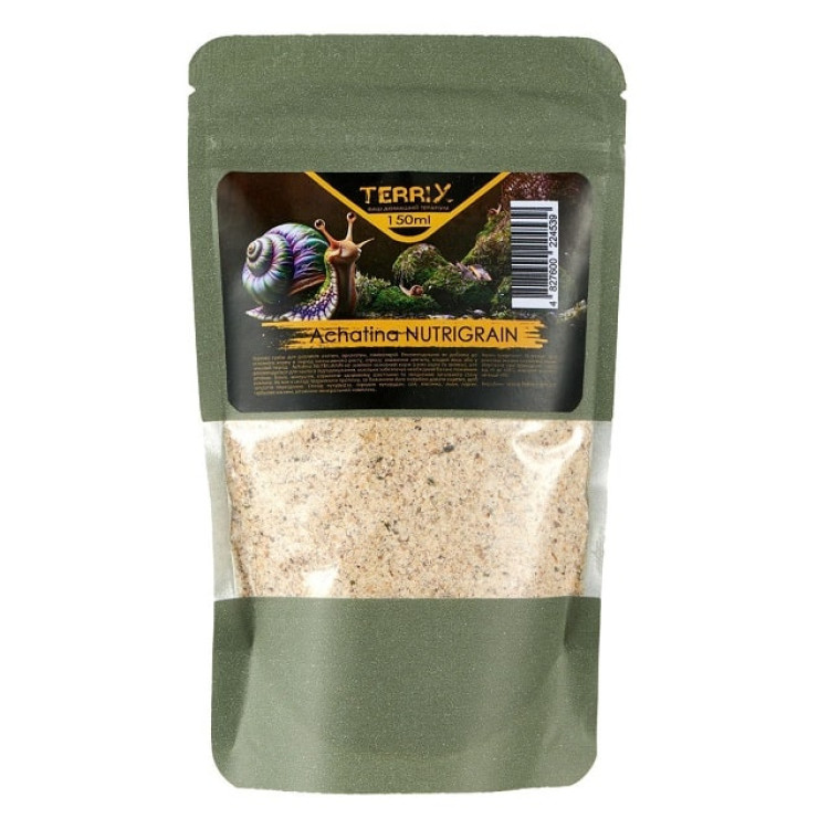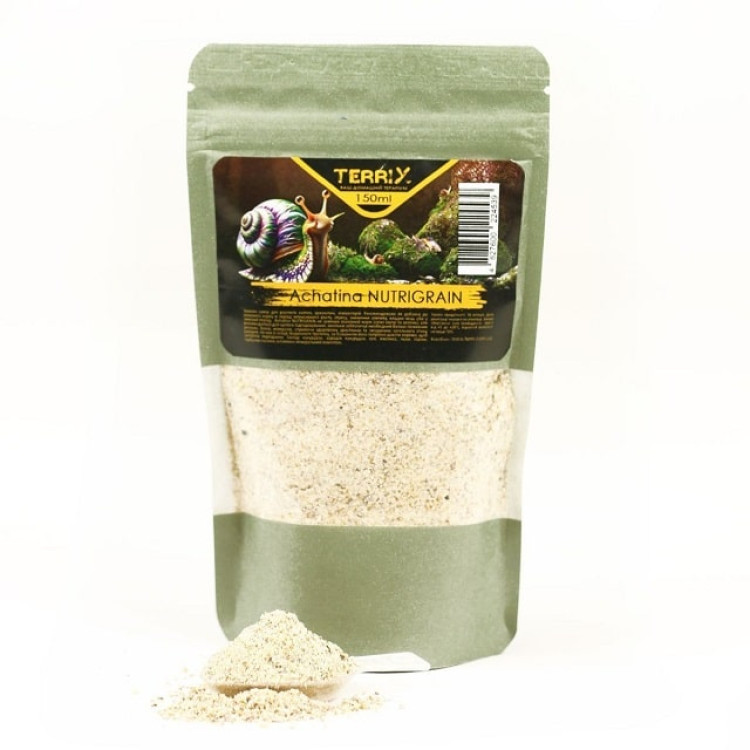 Зернова суміш для равликів ахатин, архахатин, ліміколярій. Рекомендовано як добавка до основного корму в період інтенсивного росту, стресу, зниження апетиту, кладки яєць або у зимовий період. Achatina NUTRIGRAIN не замінює основний корм (свіжі овчі та зелень), але рекомендується для частого підгодовування, оскільки забезпечує необхідний баланс поживних речовин, білків, мінералів, сприяючи здоровому зростанню та зміцненню загального стану равликів. Не має в складі тваринного протеїну, за бажанням його потрібно давати окремо, щоб запобігти переїданню.