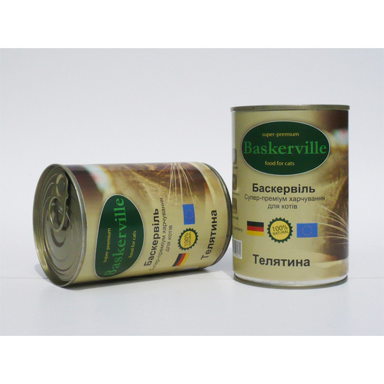 Консерви для кішок Baskerville телятина — це збалансований корм для вашого кота. У складі німецького корму з телятиною для котів міститься тільки м'ясо. Корм для кошенят "Baskerville телятина" повністю гіпоалергенний — його можна використовувати як повнораціонний корм на кожен день, так і як делікатес для вашого кошеняти. Ваш вусатий друг буде здоровий та активний завдяки повному комплексу вітамін і відсутності штучних консервантів і барвників.