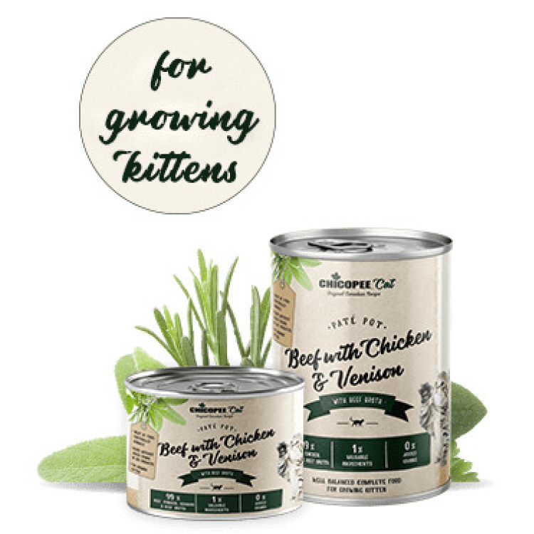 Консерви CHICOPEE являють собою повнораціонний вологий корм для кошенят, що виготовляється на заводі у Німеччині з висикоякісних м'яса та овочів.
