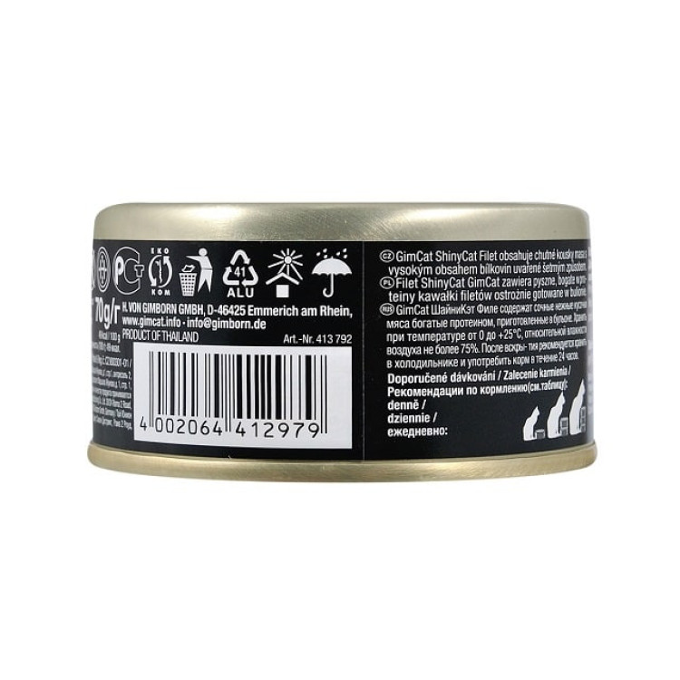 Вологий корм GimСаt (ДжимКет) ShinyCat виготовлений за сучасними технологіями. Рецептура консерви виключає шкідливі для здоров'я вихованця штучні барвники, підсилювачі смаку, консерванти, цукор і продукти, що містять ГМО. Консерви допоможуть урізноманітнити харчування Вашого улюбленця, вони мають натуральний запах та смак, і сподобаються йому.