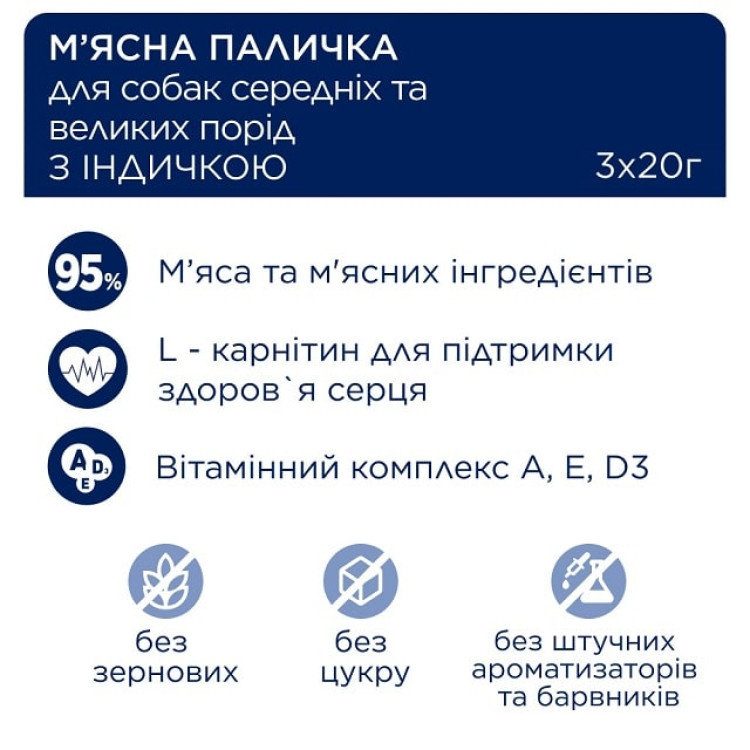Продукт містить 95% м’ясних інгредієнтів (зокрема 30 % з індички) та вітамінний комплекс A, E, D3 та L-карнітин. Беззернові палички виготовлені без використання цукру, сої, штучних ароматизаторів та барвників. Для максимального збереження свіжості продукту, кожна паличка запакована в індивідуальну металізовану упаковку. Смаколик може бути ідеальною винагородою за виконання команд на прогулянці чи в подорожі, а також як перекусом між прийомами їжі.