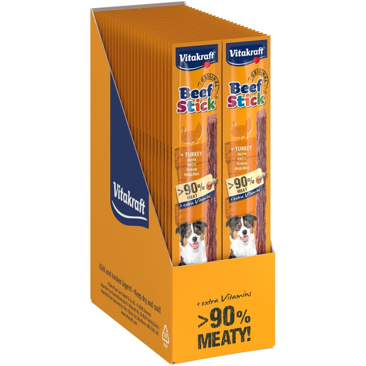Beef Stick Vitakraft® просто змушує серце кожного собаки битися швидше! Оригінальна м'ясна паличка переконує як великих, так і маленьких чотирилапих друзів – своїм унікальним, ситним смаком , неймовірно смачним ароматом та надзвичайно високим вмістом м'яса. Ідеально підходить для балування, винагородження або просто для легкого перекусу між прийомами їжі!