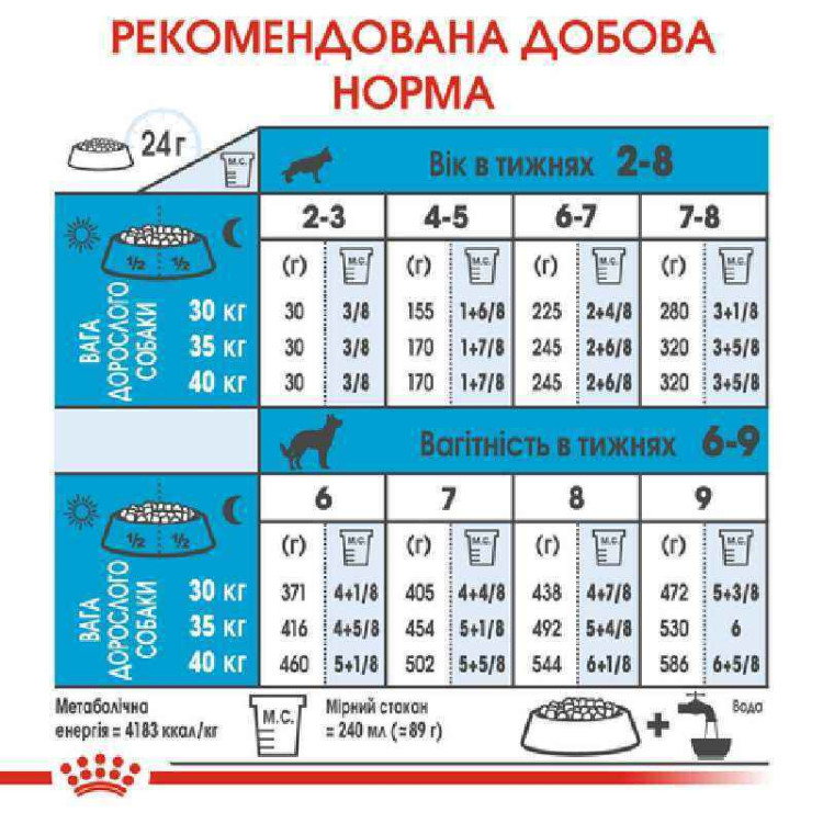 Рекомендації годування: Годування може змінюватися залежно від активності, розміру та умов проживання вихованця. Розділіть добову норму на кілька годувань і завжди давайте свіжу воду. Використовуйте таблицю годування, що є на упаковці, як орієнтир