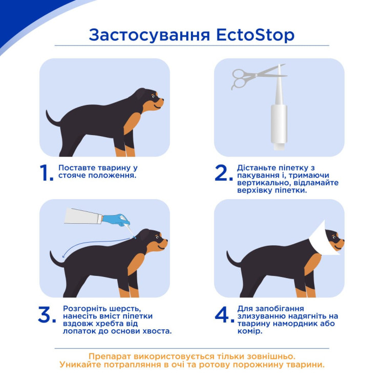 При нанесенні препарату уникайте потрапляння його в очі та ротову порожнину тварини. Для запобігання злизування препарату собаці одягають намордник або комір.