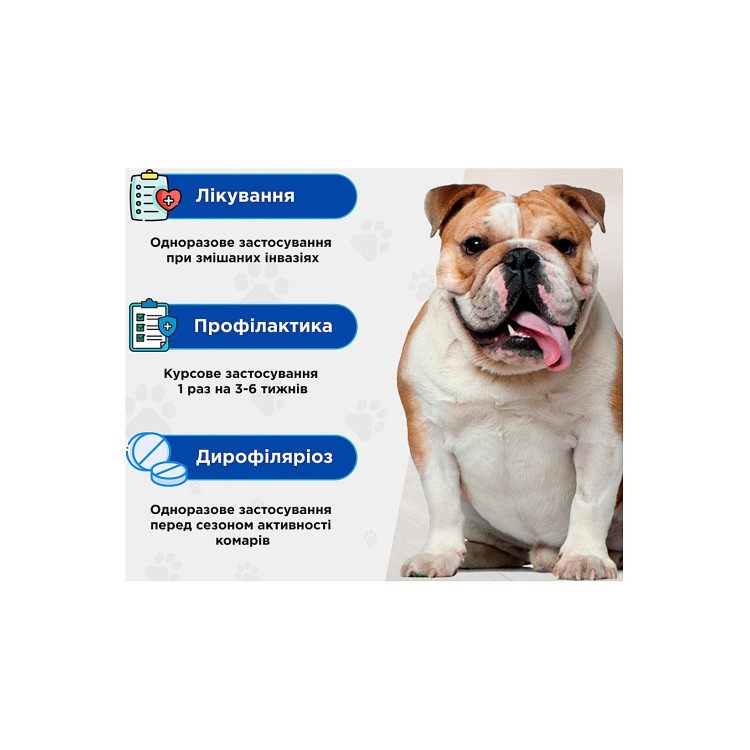 Профілактика дирофіляріозу: Dirofilaria spp. (мікрофілярії L3 та L4 стадій) сanis, Angiostrongylus vasorum.